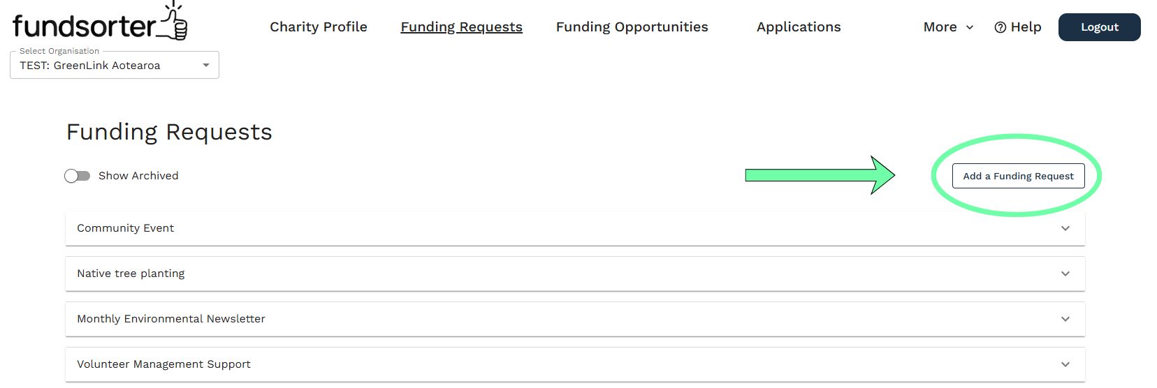 Click "Funding Requests" in the main navigation menu, then click 'Add a Funding Request'.