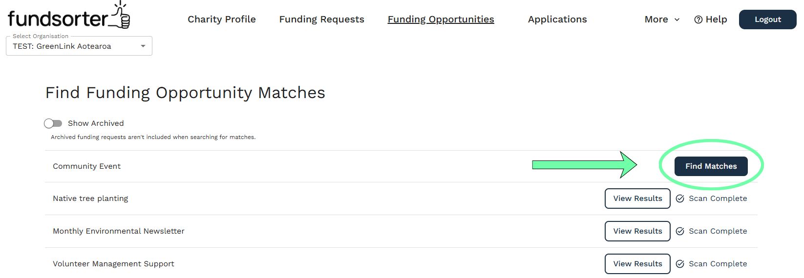 Next to a funding request, click ‘Find Matches’ for our system to begin scanning the database. The process can take a few minutes depending on the funding request.