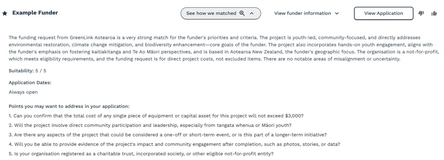 You can explore why the system identified each match. Click for information on 'How we matched' or to learn more about the funder.