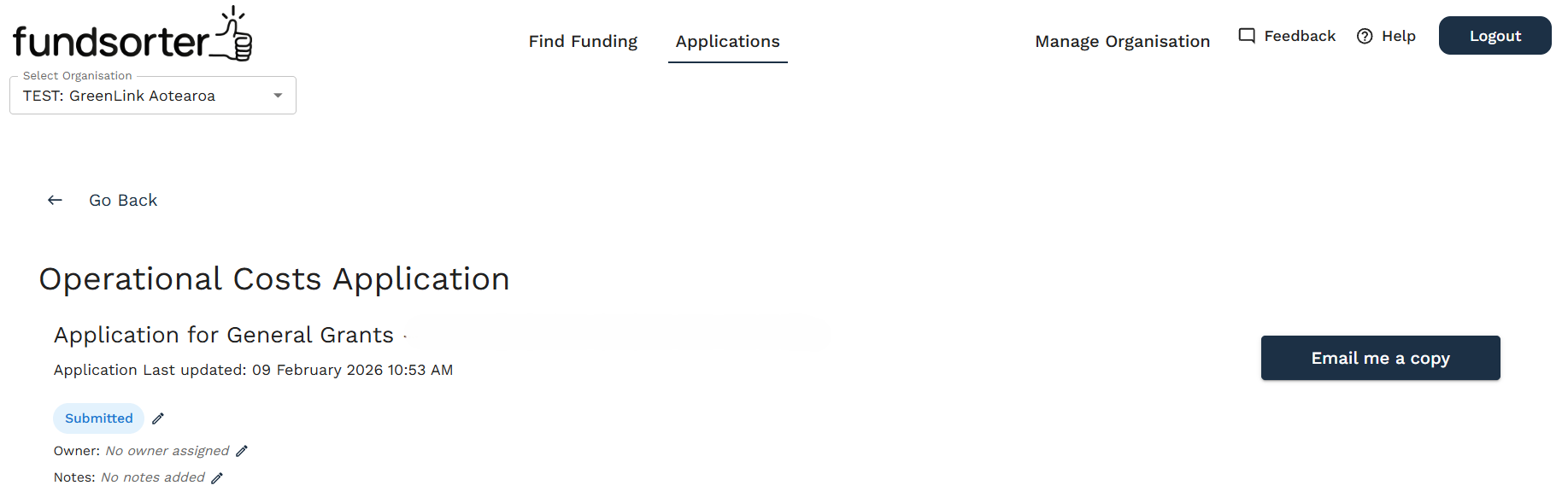 Note: Fundsorter drafts your applications but we do not submit applications on your behalf. Once you have edited your draft application and you're happy with the responses, hit the "Email me a copy" button. We'll email you the drafted application responses, along with details on where to make your submission.