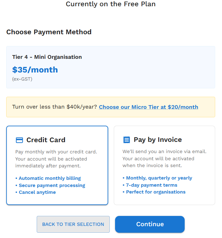 - Micro Tier: Organisations with an annual turnover of less than $40,000 can select the Micro Tier option here.