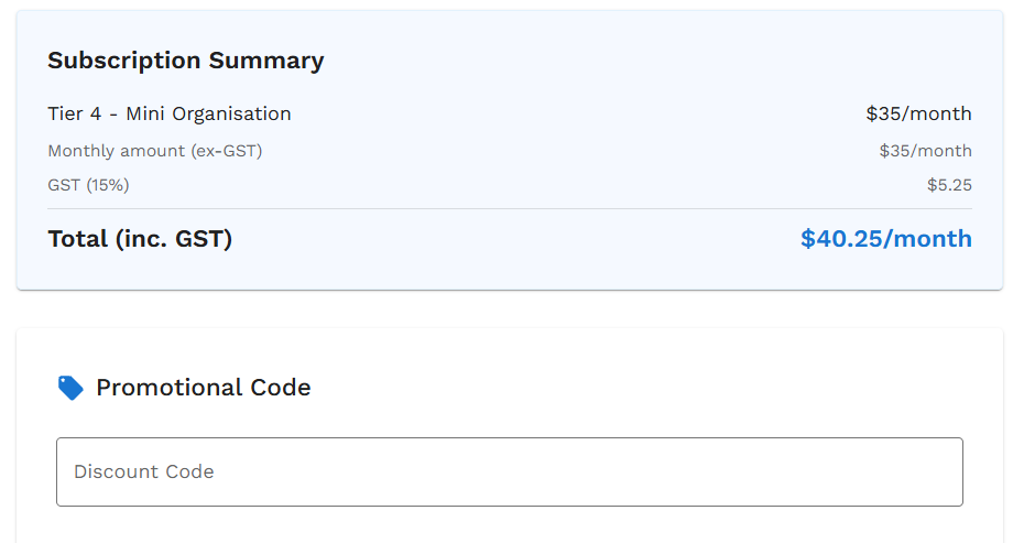 For organisations with annual expenditure less than $40,000 per year, we offer a Micro Tier pricing - this can be selected when signing up to a paid account.
